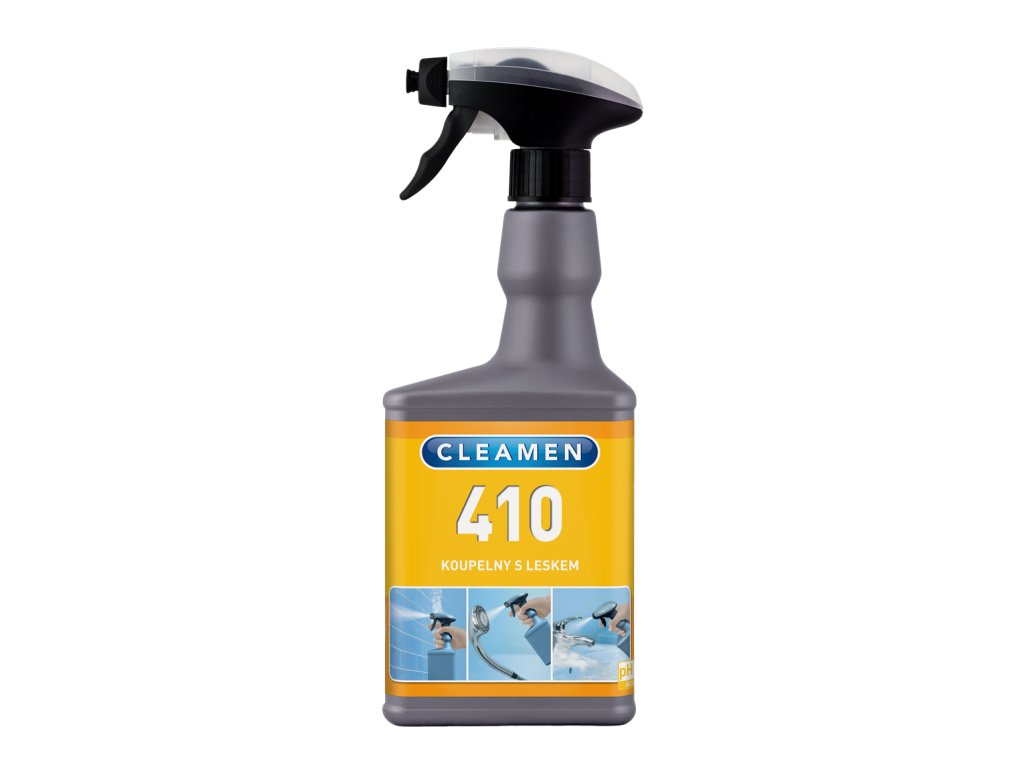 CLEAMEN 410 Koupelny s leskem 550 ml je tekutý prostředek určený k mytí sanitárních a umývárenských ploch jako jsou obklady, umyvadla, vany, sprchové kouty, umyvadla, baterie, vnější části toaletních mís atd. Není vhodný na povrchy, které nemají odolnost proti kyselinám. Přípravek snadno odstraňuje skvrny a nánosy vodního kamene. Přípravek obsahuje lesk, který zpomaluje znečištění povrchu a dlouhodobě zlepšuje vzhled leštěných a chromovaných povrchů.