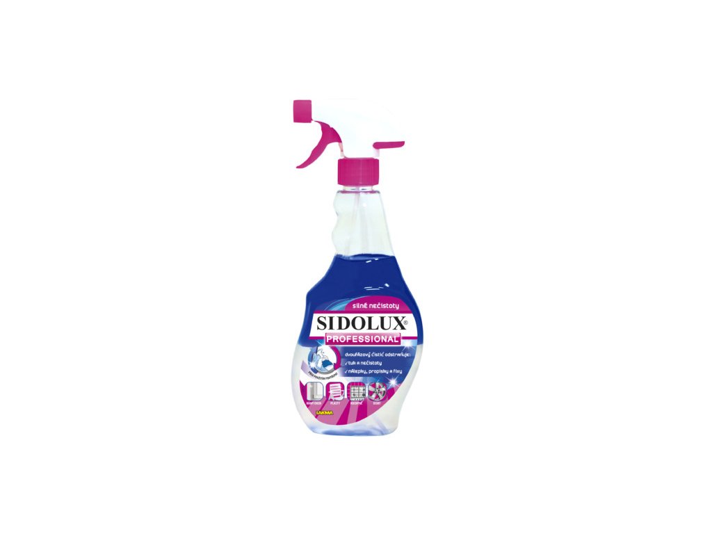 SIDOLUX PROFESSIONAL Na silné nečistoty – Dvoufázový 500 ml je určen na odstraňování silných a úporných nečistot, včetně specifických – mastnoty, lepidel od nálepek, stop od propisek a čár od fixů. Dále je určen na čištění okenních rámů, zahradního nábytku, jízdních kol, alu kol a jiných odolných omyvatelných povrchů. Jedná se o moderní přípravek pro odstranění silných nečistot.
